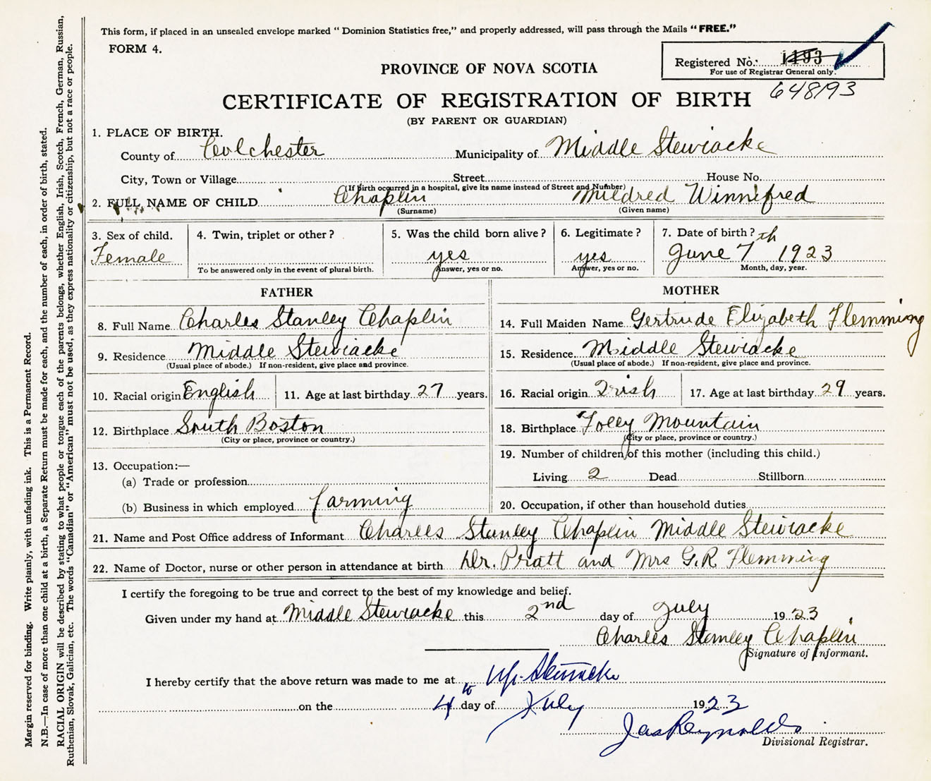 Female Birth Registration: Year: 1923 number: 64800193