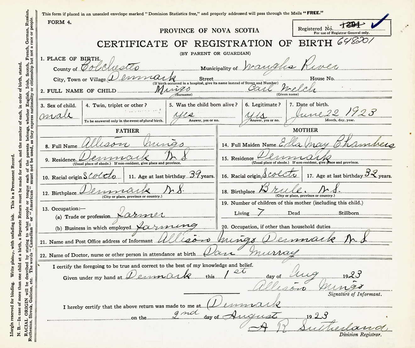 Male Birth Registration: Year: 1923 number: 64800201