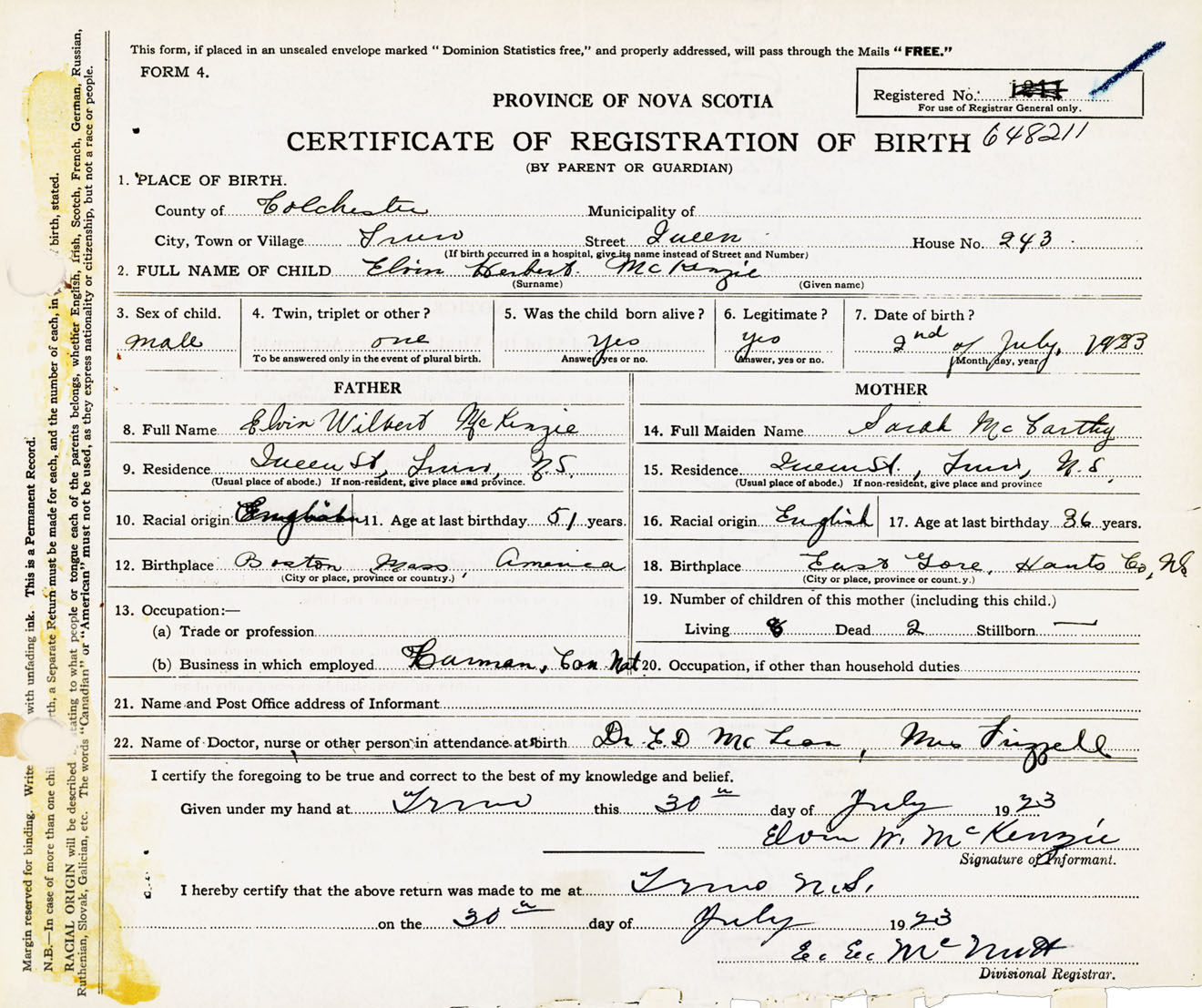 Male Birth Registration: Year: 1923 number: 64800211