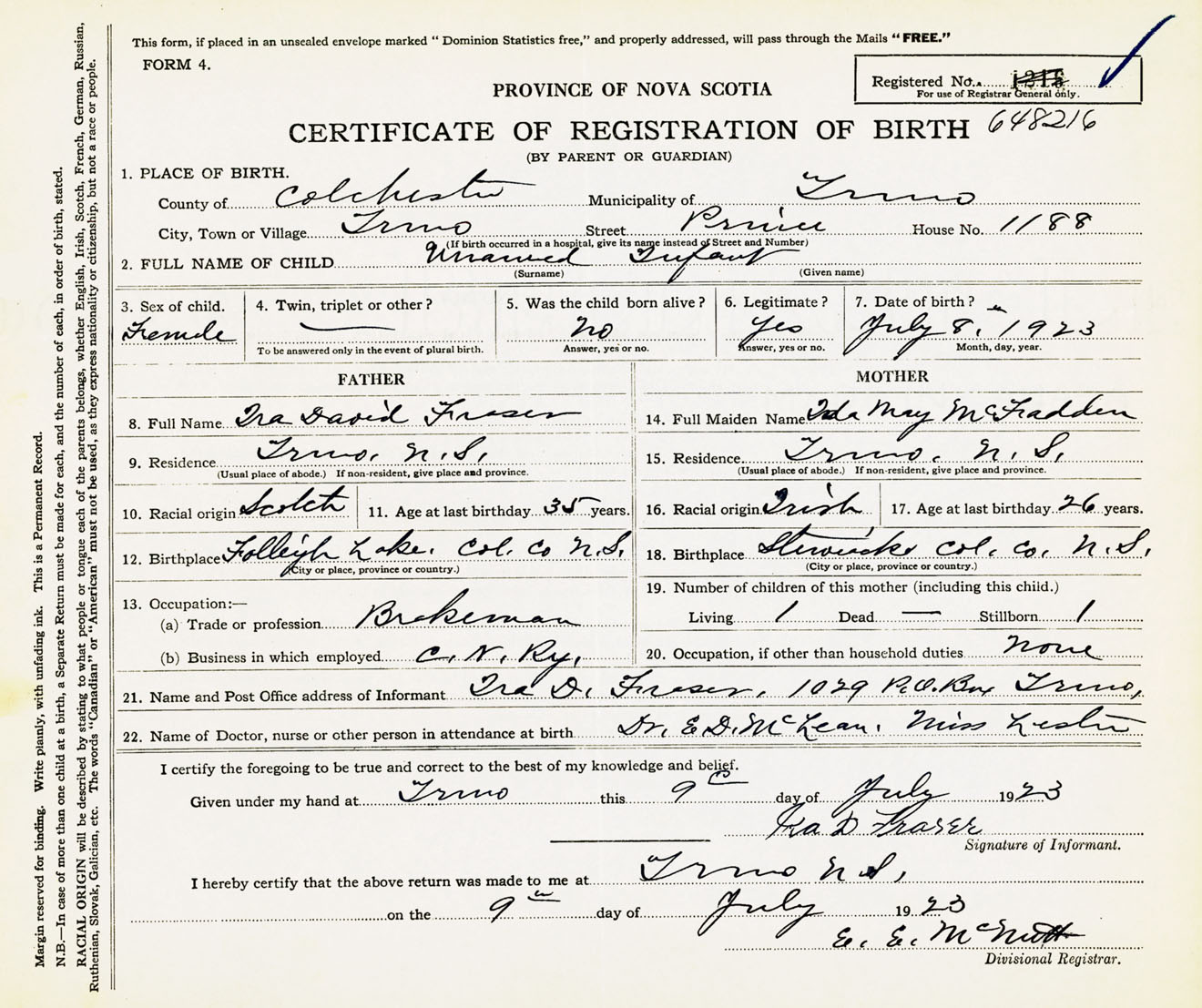 Female Birth Registration: Year: 1923 number: 64800216