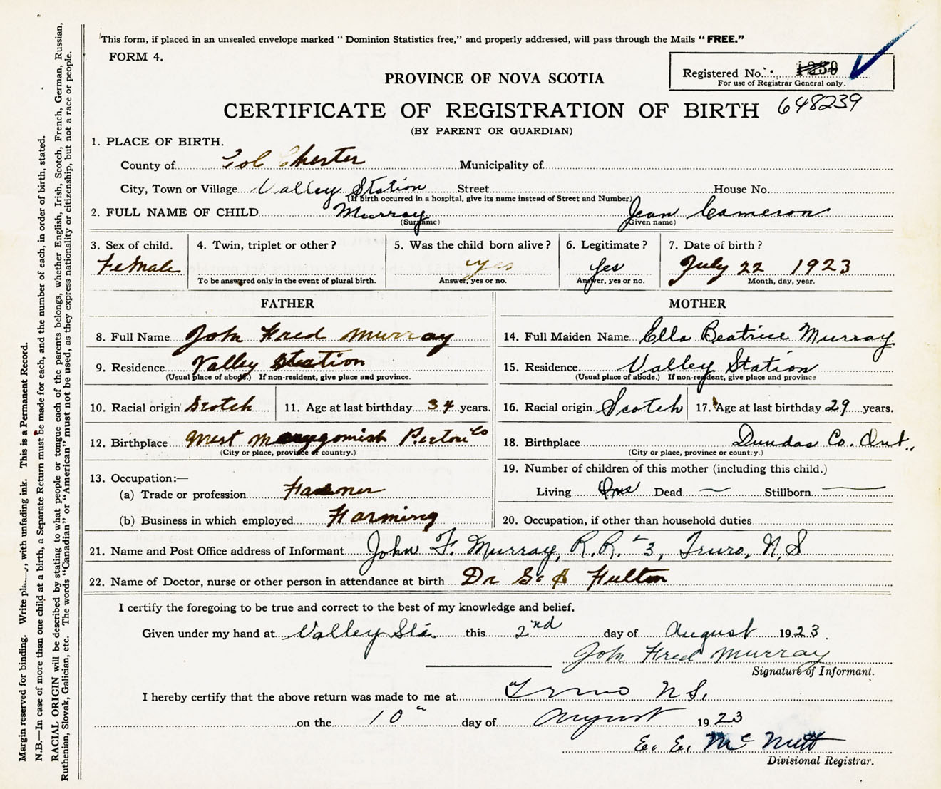 Female Birth Registration: Year: 1923 number: 64800239