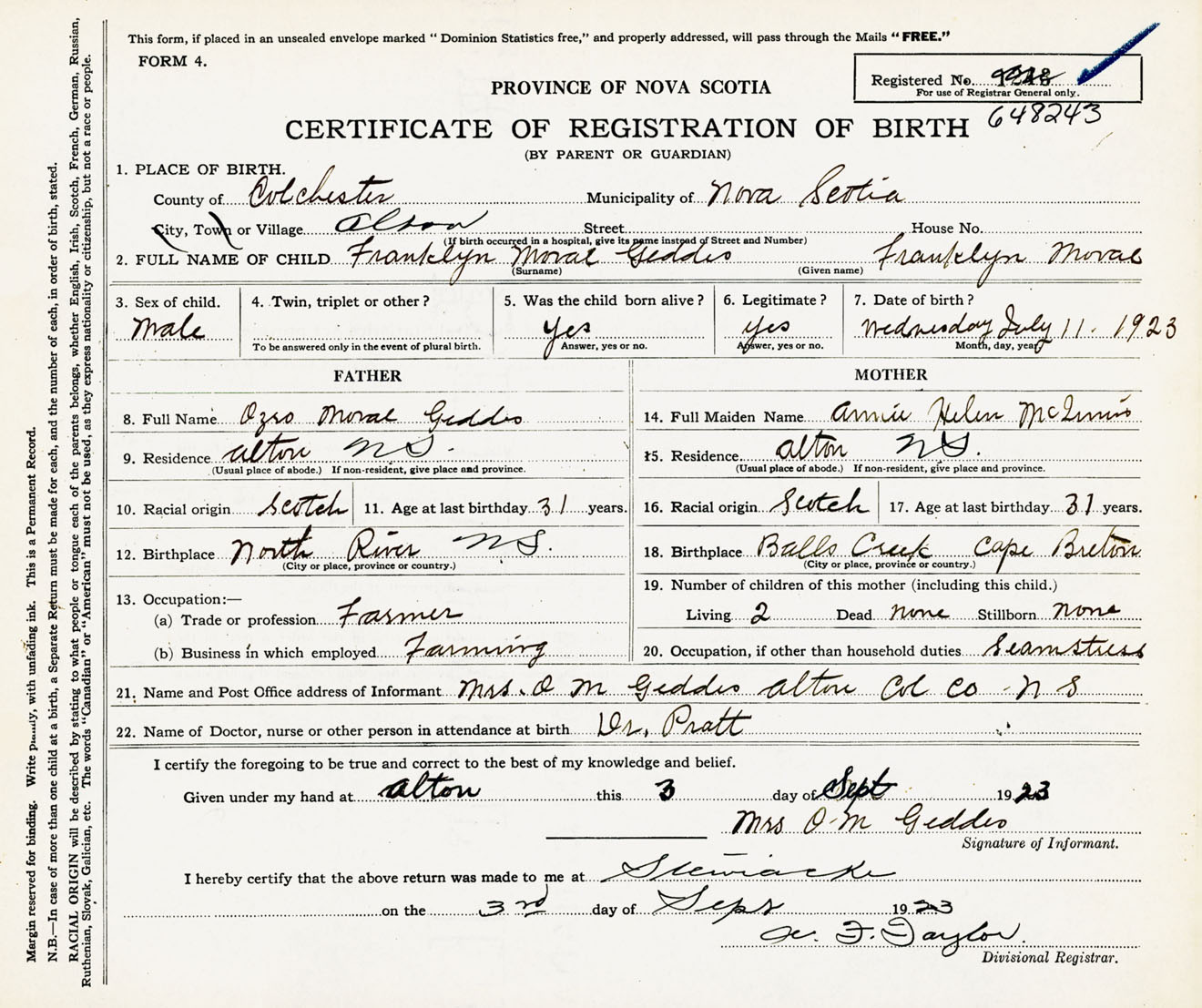 Male Birth Registration: Year: 1923 number: 64800243