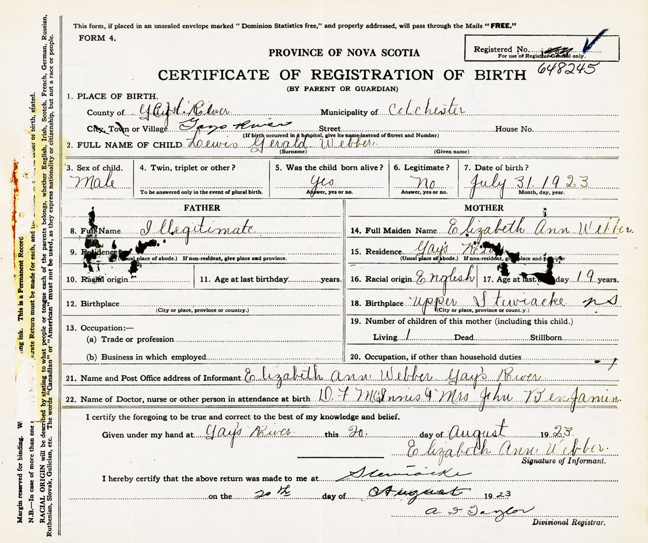 Male Birth Registration: Year: 1923 number: 64800245