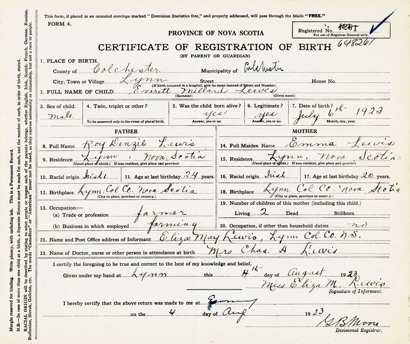 Male Birth Registration: Year: 1923 number: 64800261
