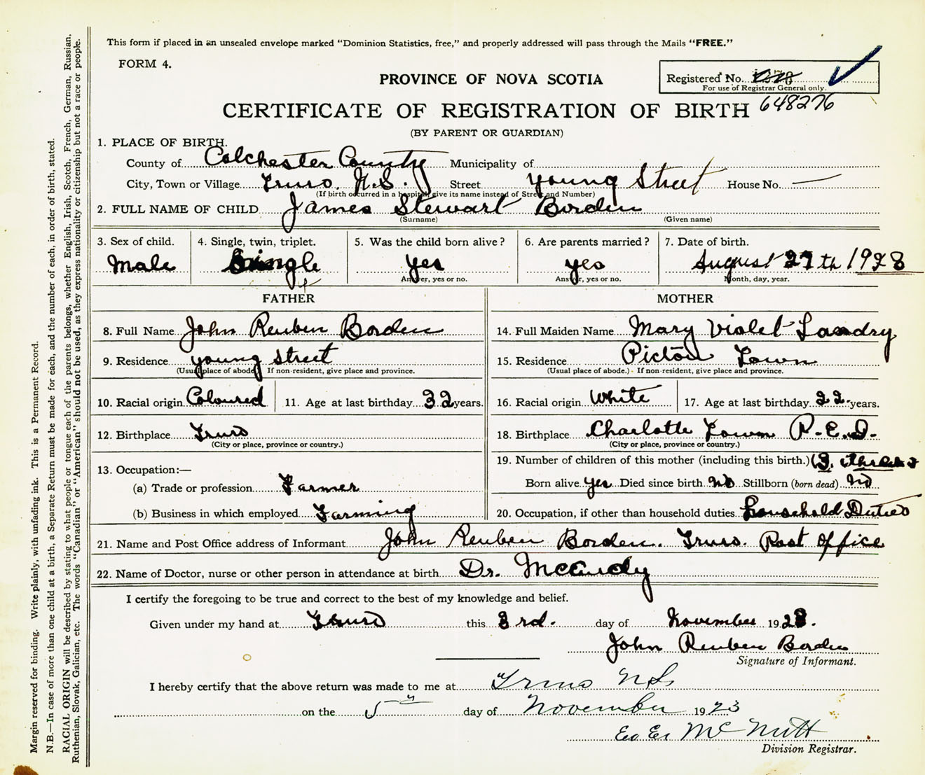 Male Birth Registration: Year: 1923 number: 64800276