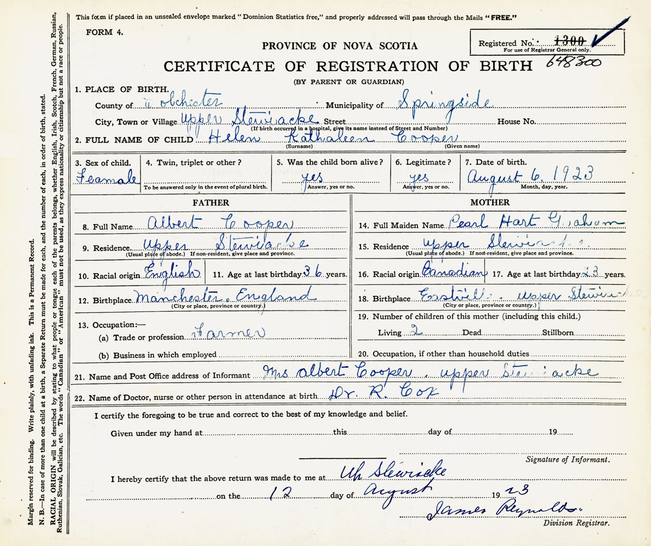 Female Birth Registration: Year: 1923 number: 64800300