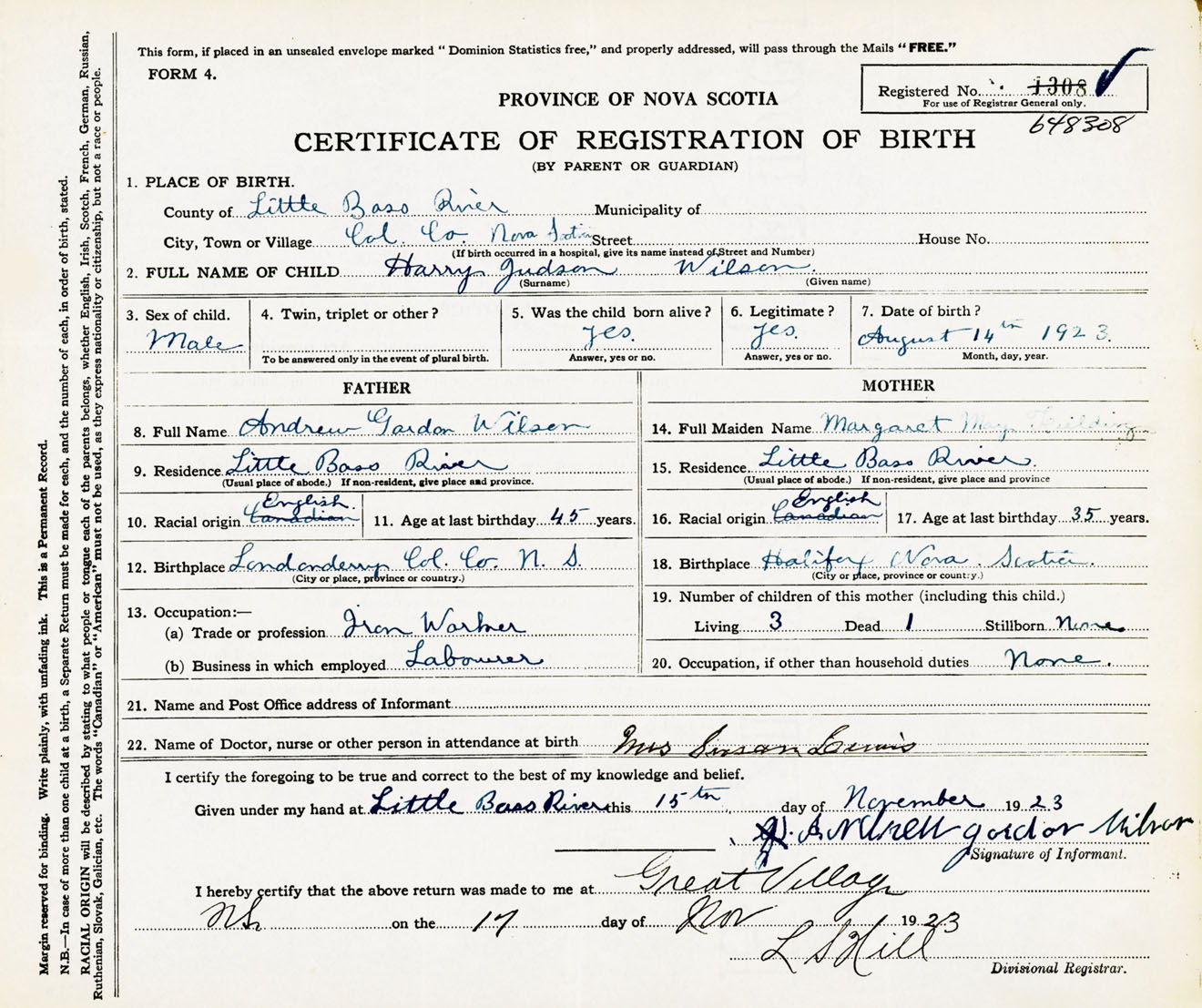 Male Birth Registration: Year: 1923 number: 64800308
