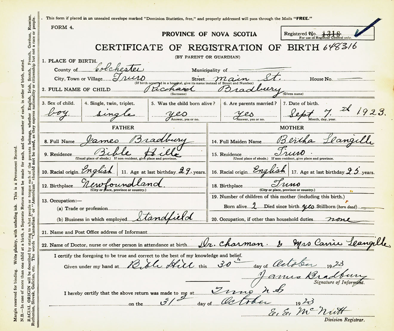 Male Birth Registration: Year: 1923 number: 64800316