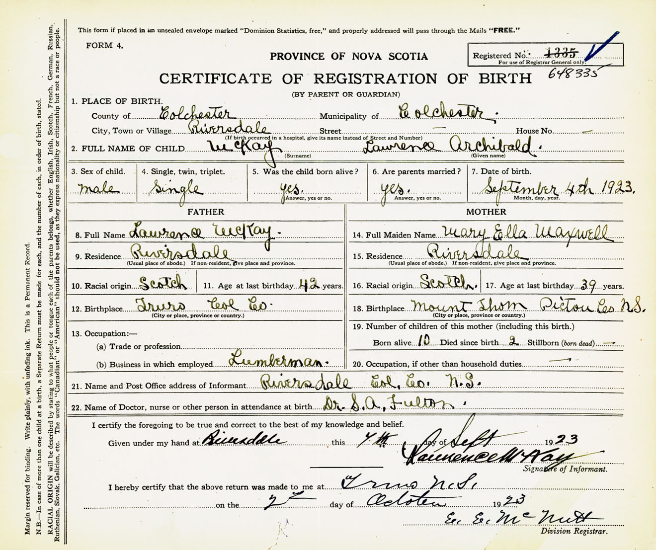 Male Birth Registration: Year: 1923 number: 64800335