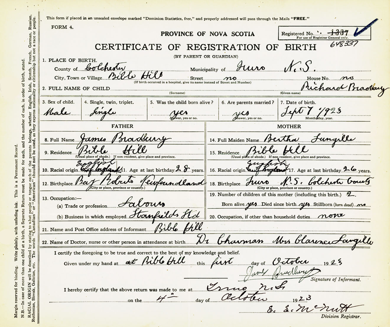 Male Birth Registration: Year: 1923 number: 64800337