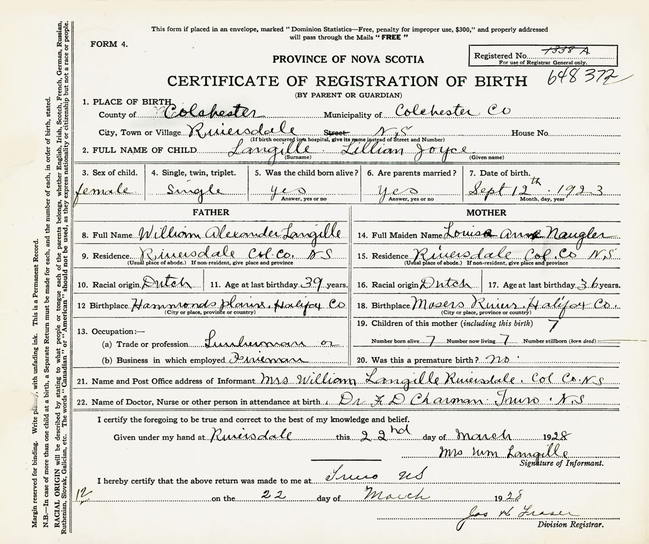 Female Birth Registration: Year: 1923 number: 64800372