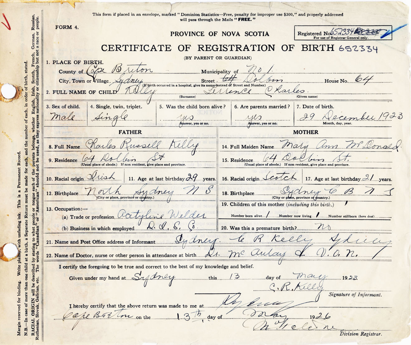 Male Birth Registration: Year: 1923 number: 65200334