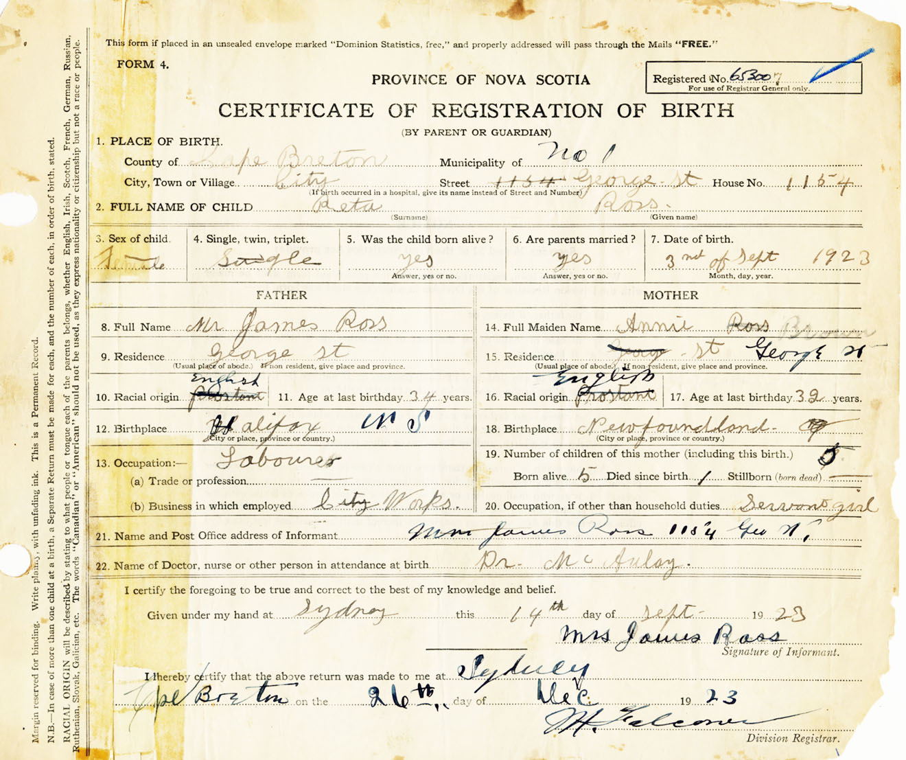Female Birth Registration: Year: 1923 number: 65300007