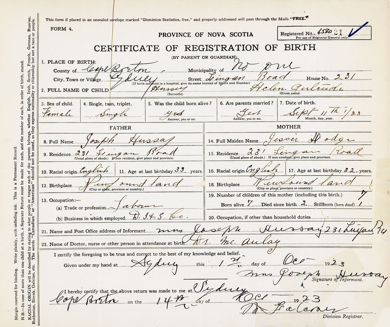 Female Birth Registration: Year: 1923 number: 65300021