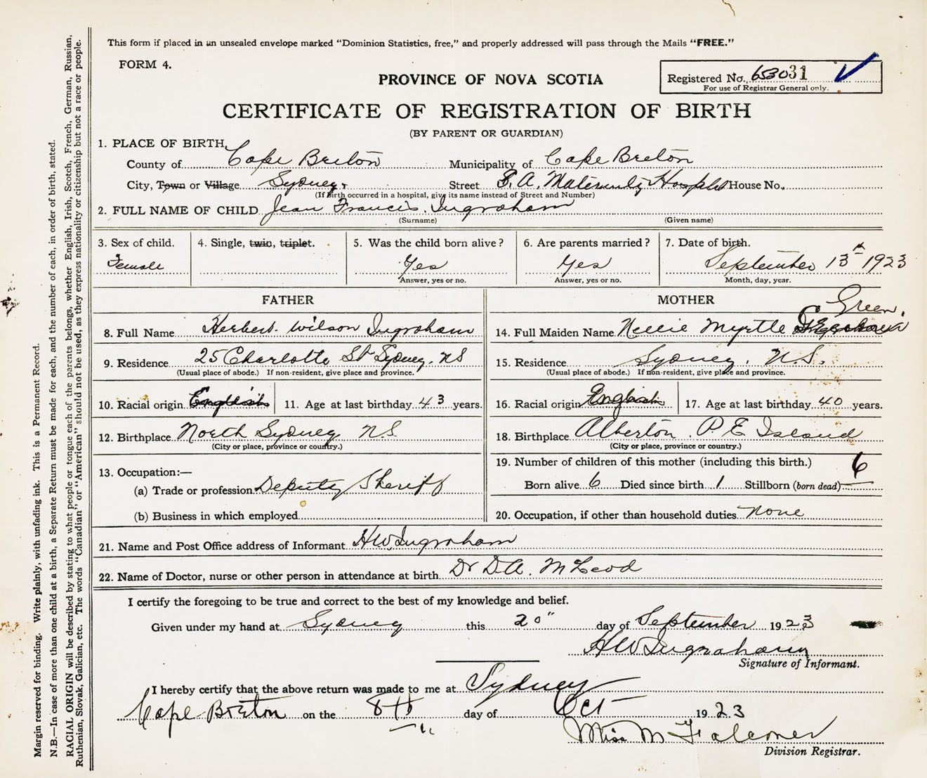 Female Birth Registration: Year: 1923 number: 65300031