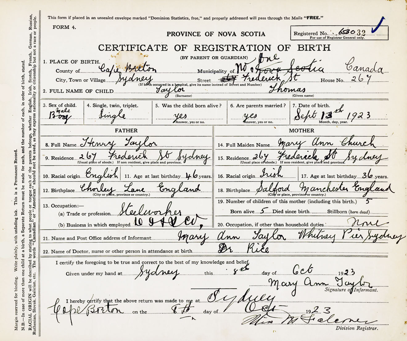 Male Birth Registration: Year: 1923 number: 65300032