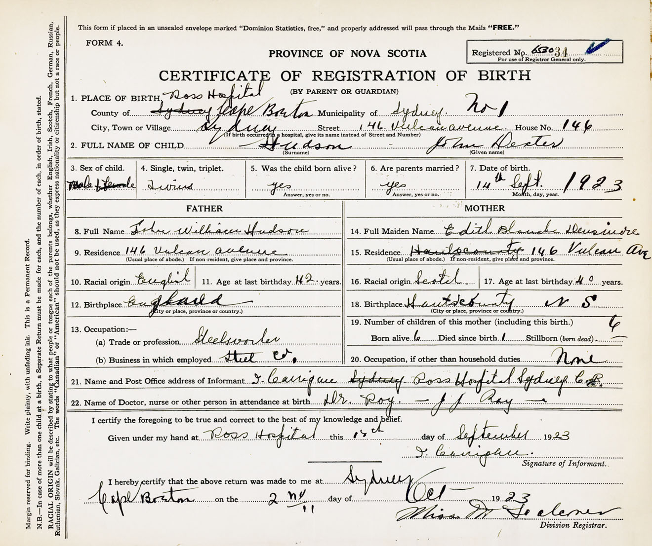 Male Birth Registration: Year: 1923 number: 65300034