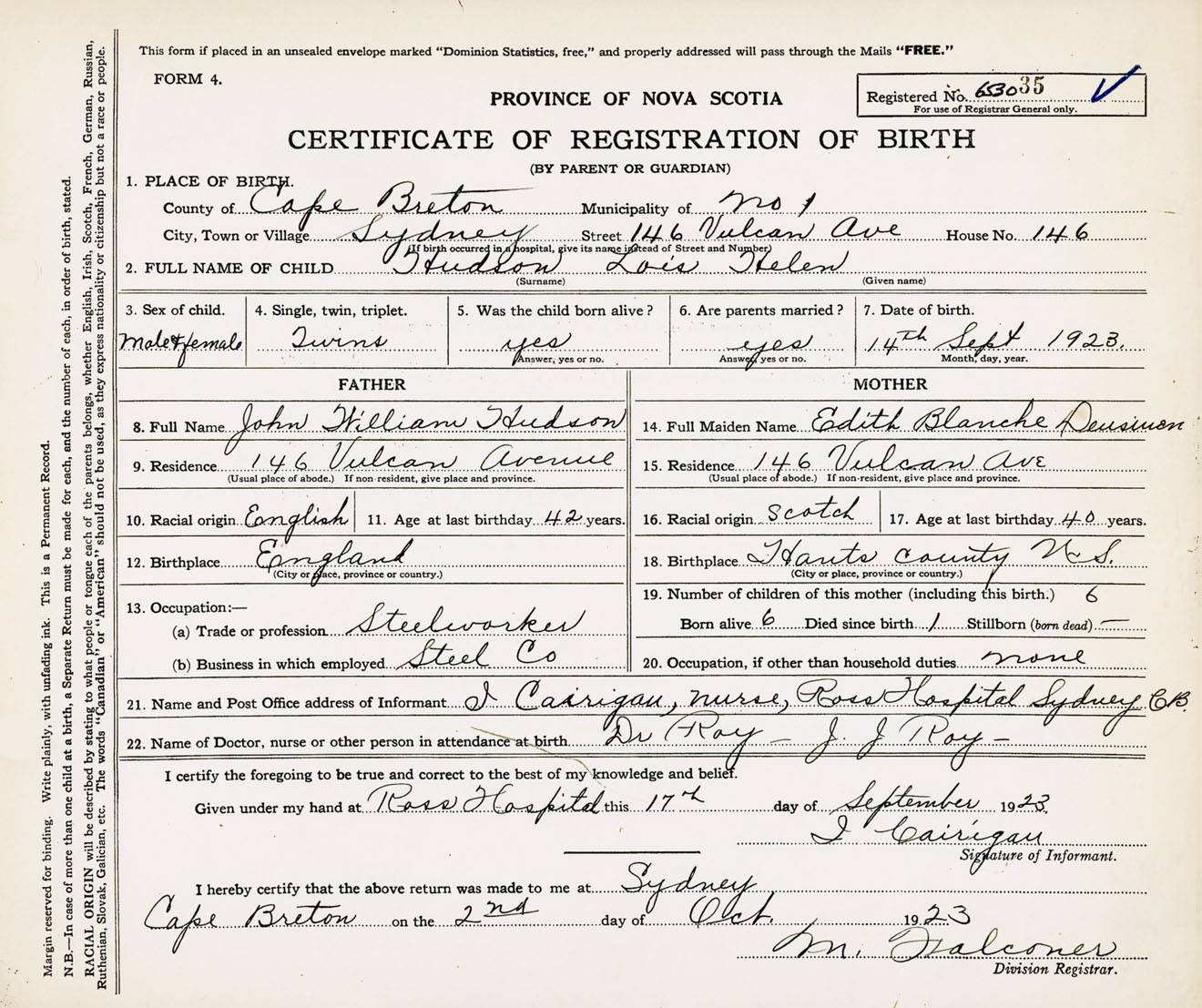 Female Birth Registration: Year: 1923 number: 65300035