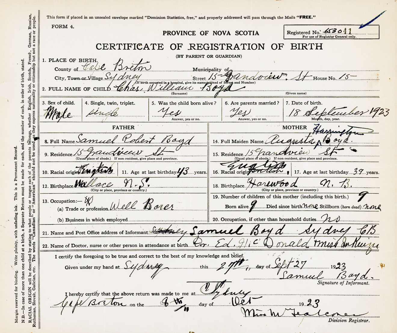 Male Birth Registration: Year: 1923 number: 65300041