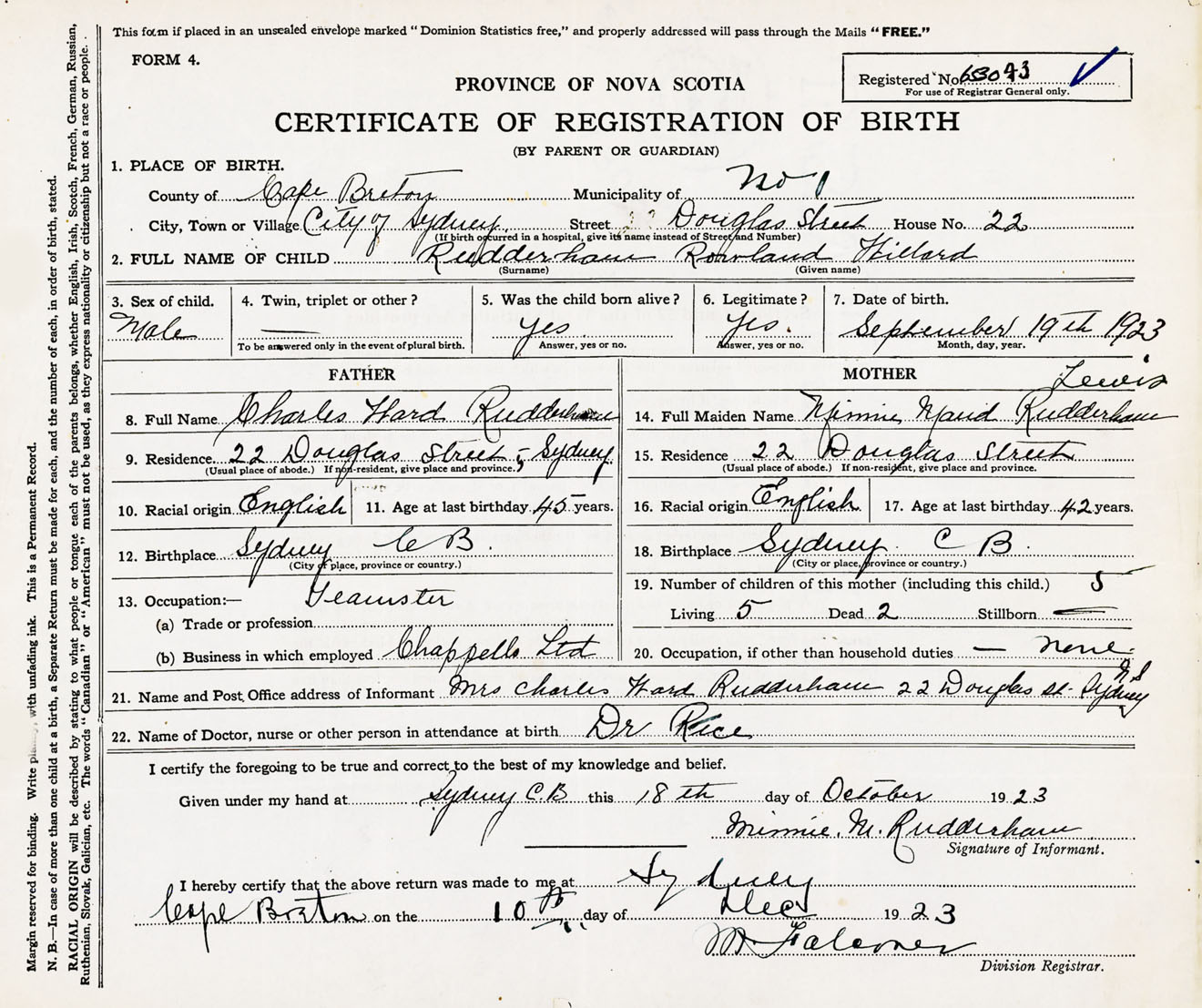 Male Birth Registration: Year: 1923 number: 65300043