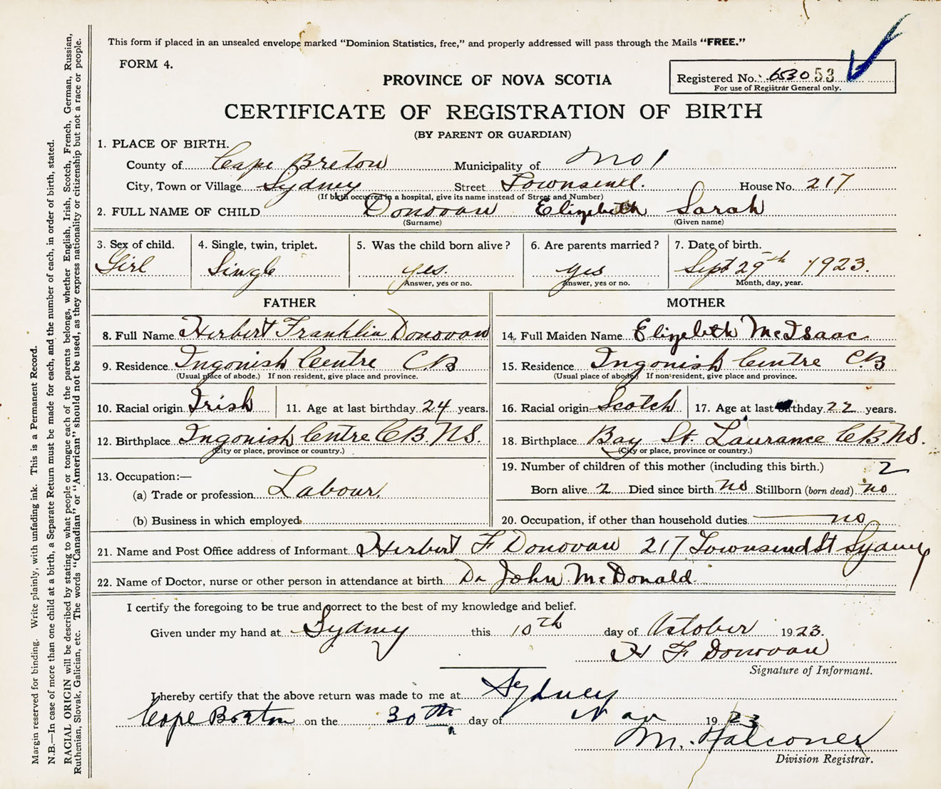 Female Birth Registration: Year: 1923 number: 65300053