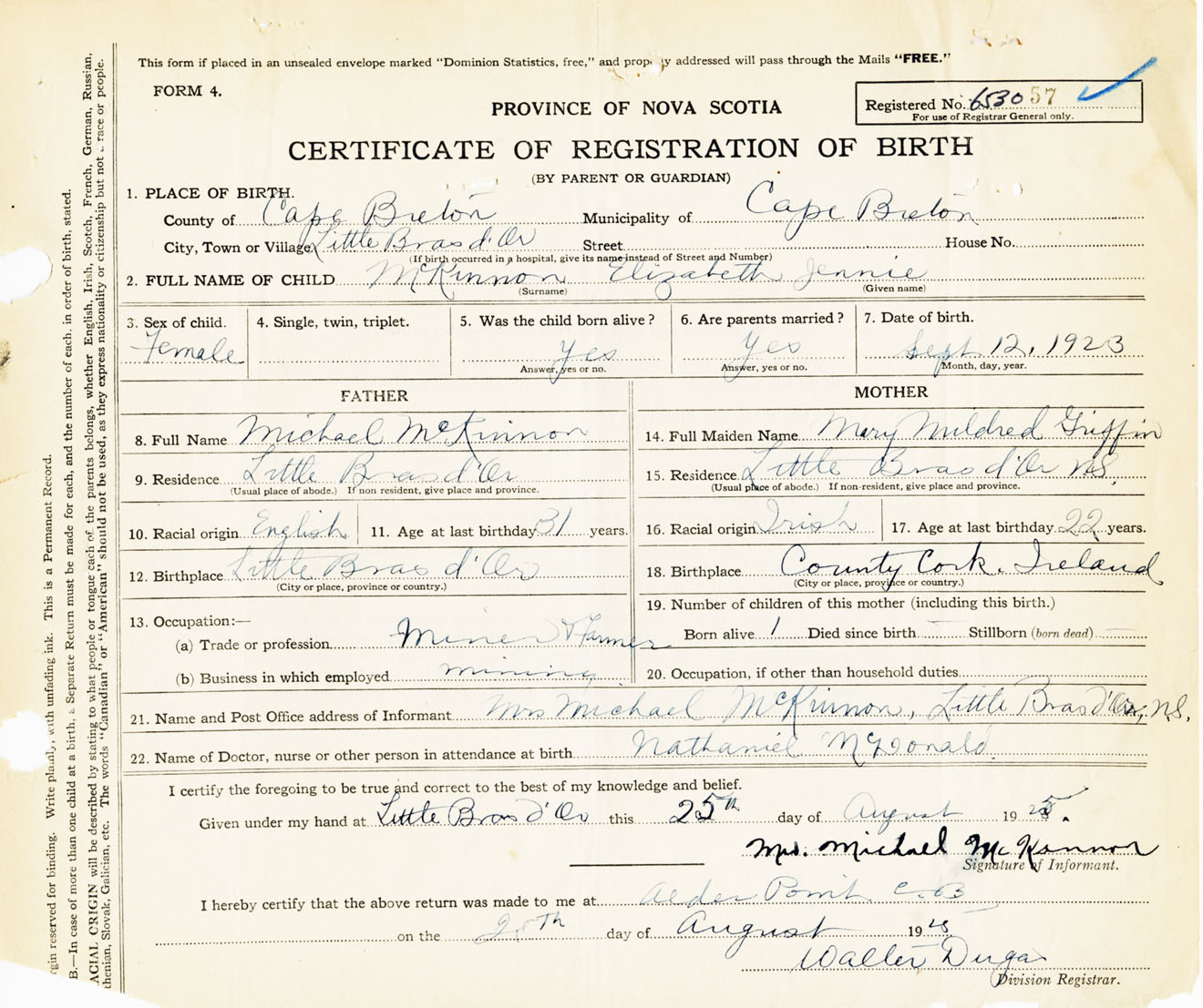 Female Birth Registration: Year: 1923 number: 65300057