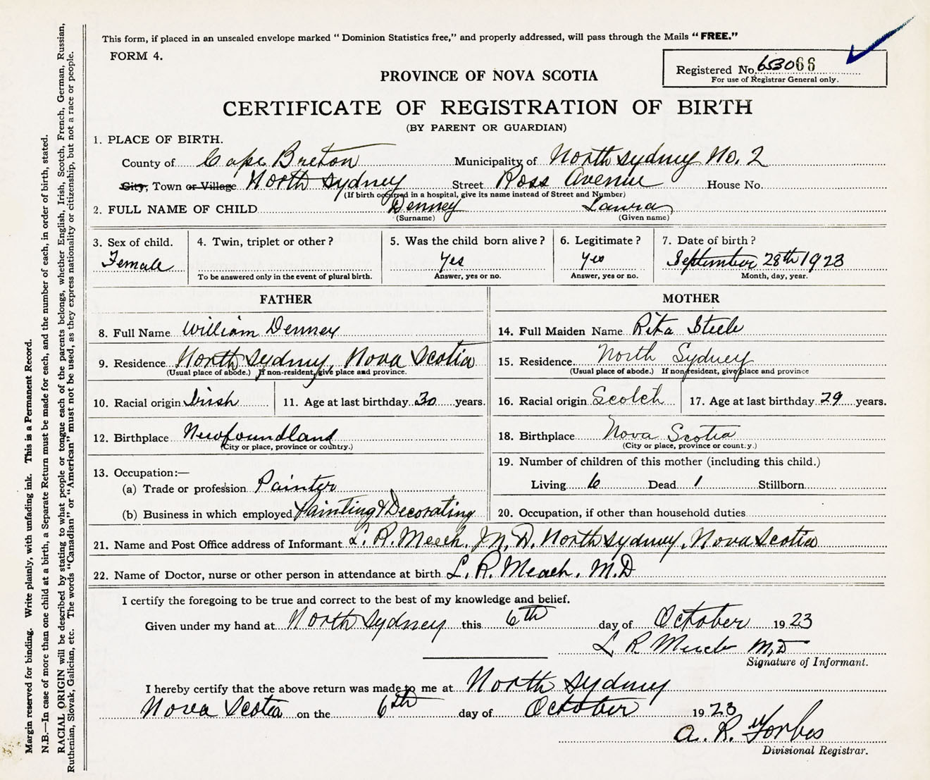Female Birth Registration: Year: 1923 number: 65300066