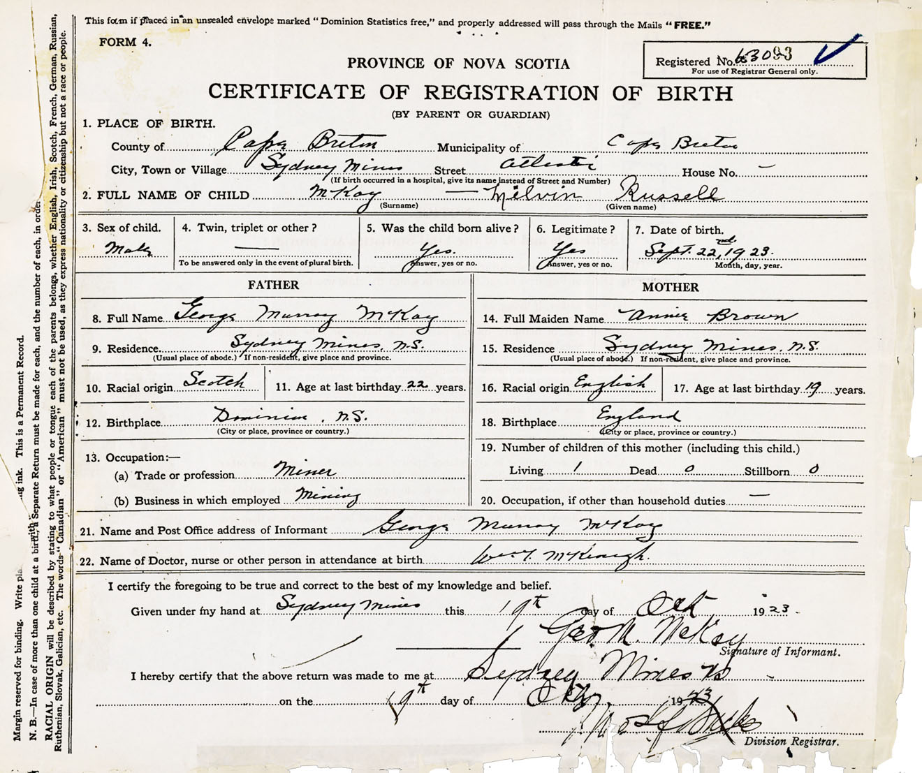 Male Birth Registration: Year: 1923 number: 65300093