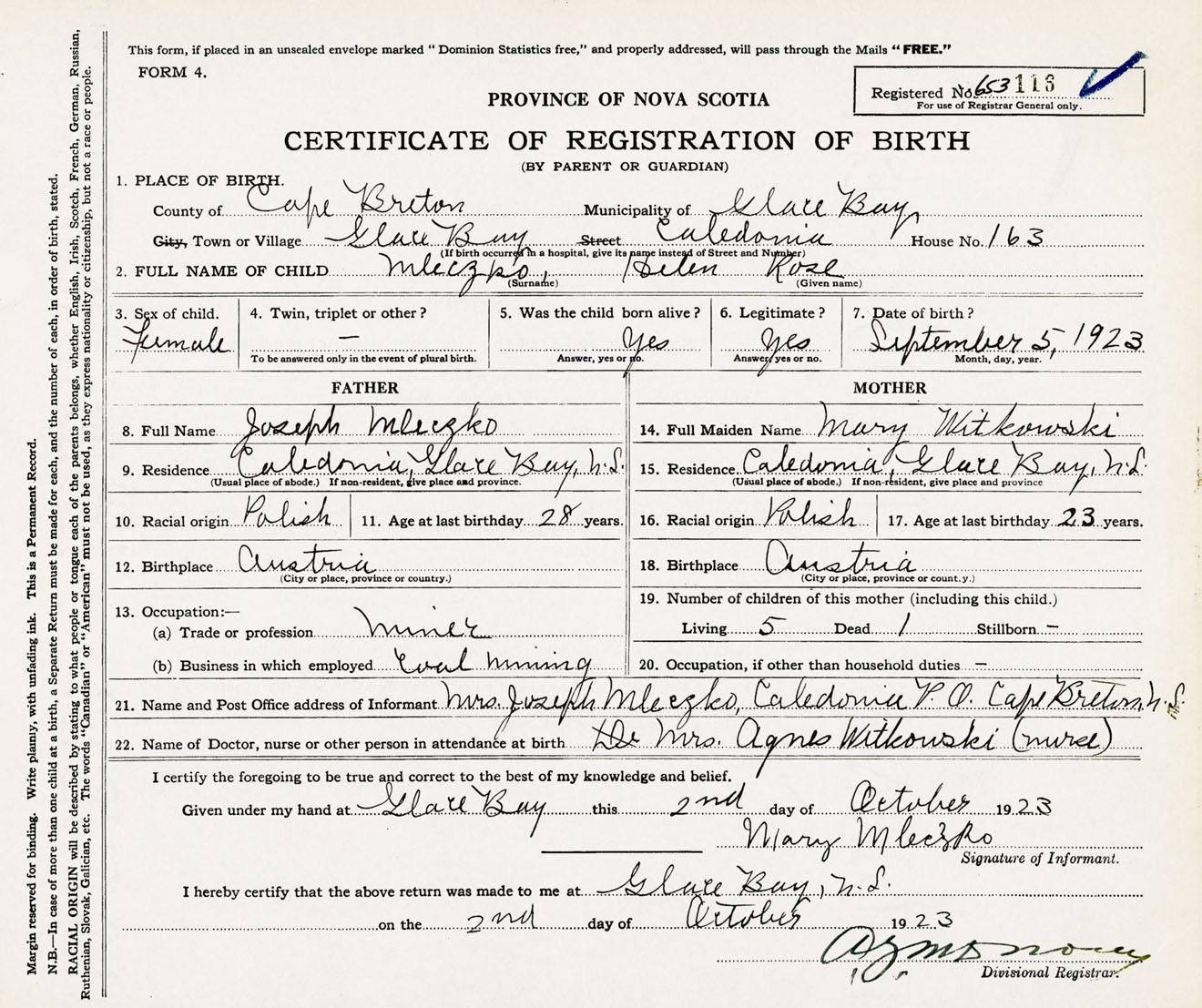 Female Birth Registration: Year: 1923 number: 65300116
