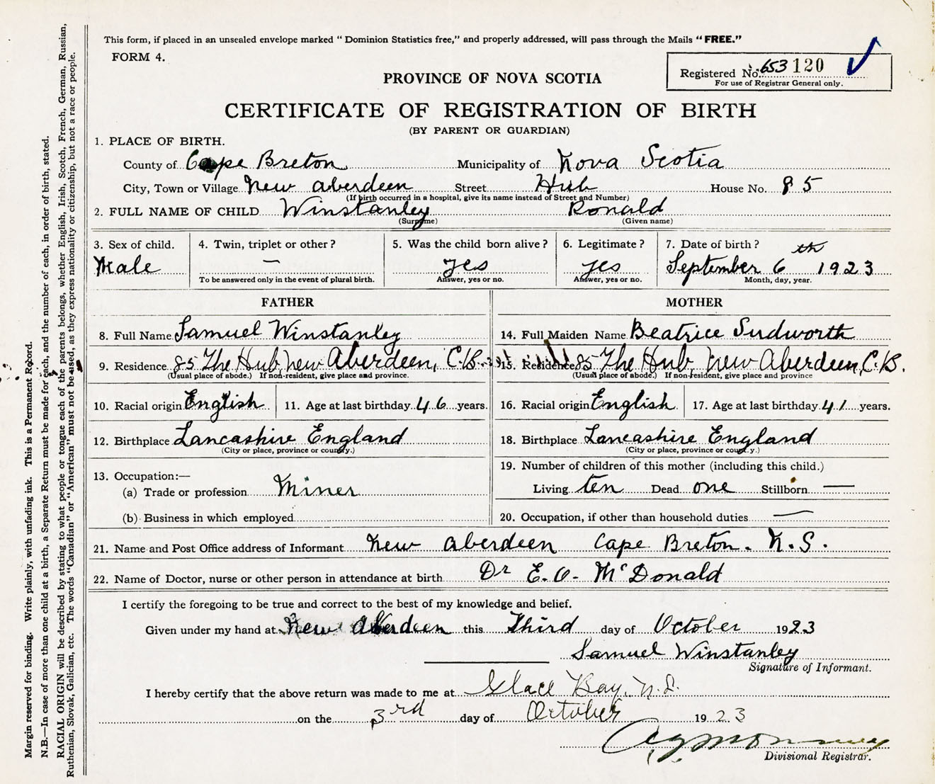 Male Birth Registration: Year: 1923 number: 65300120