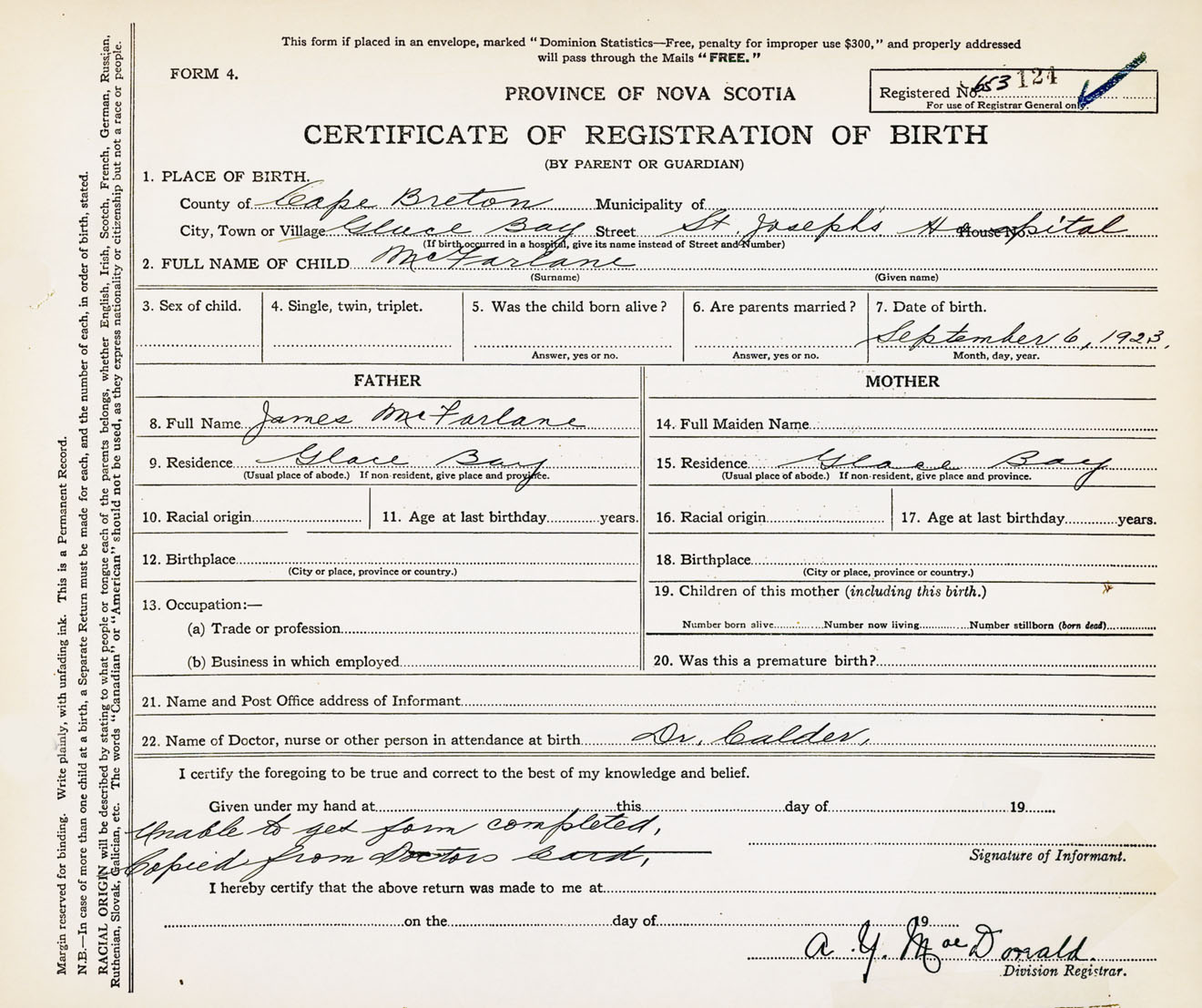 Birth Registration: Year: 1923 number: 65300124