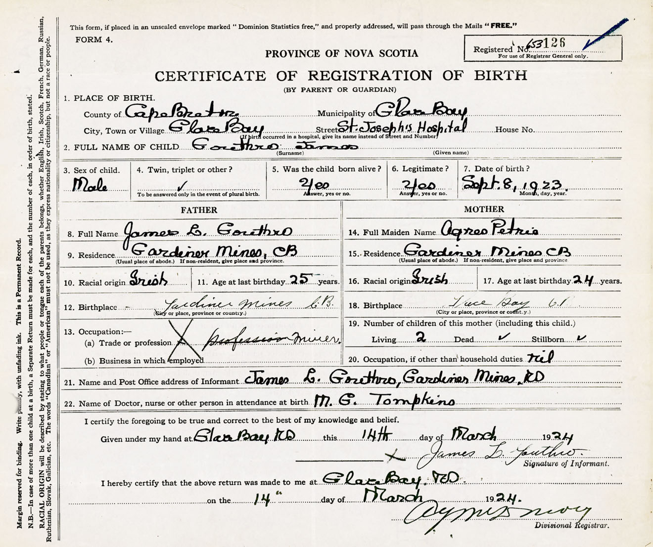 Male Birth Registration: Year: 1923 number: 65300126