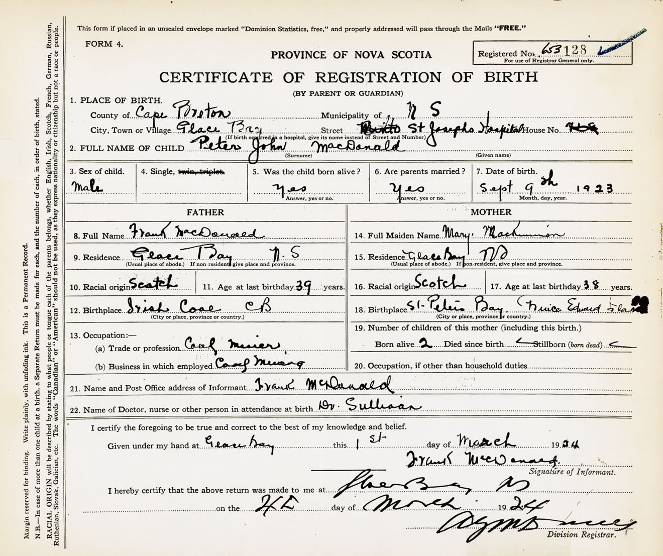 Male Birth Registration: Year: 1923 number: 65300128