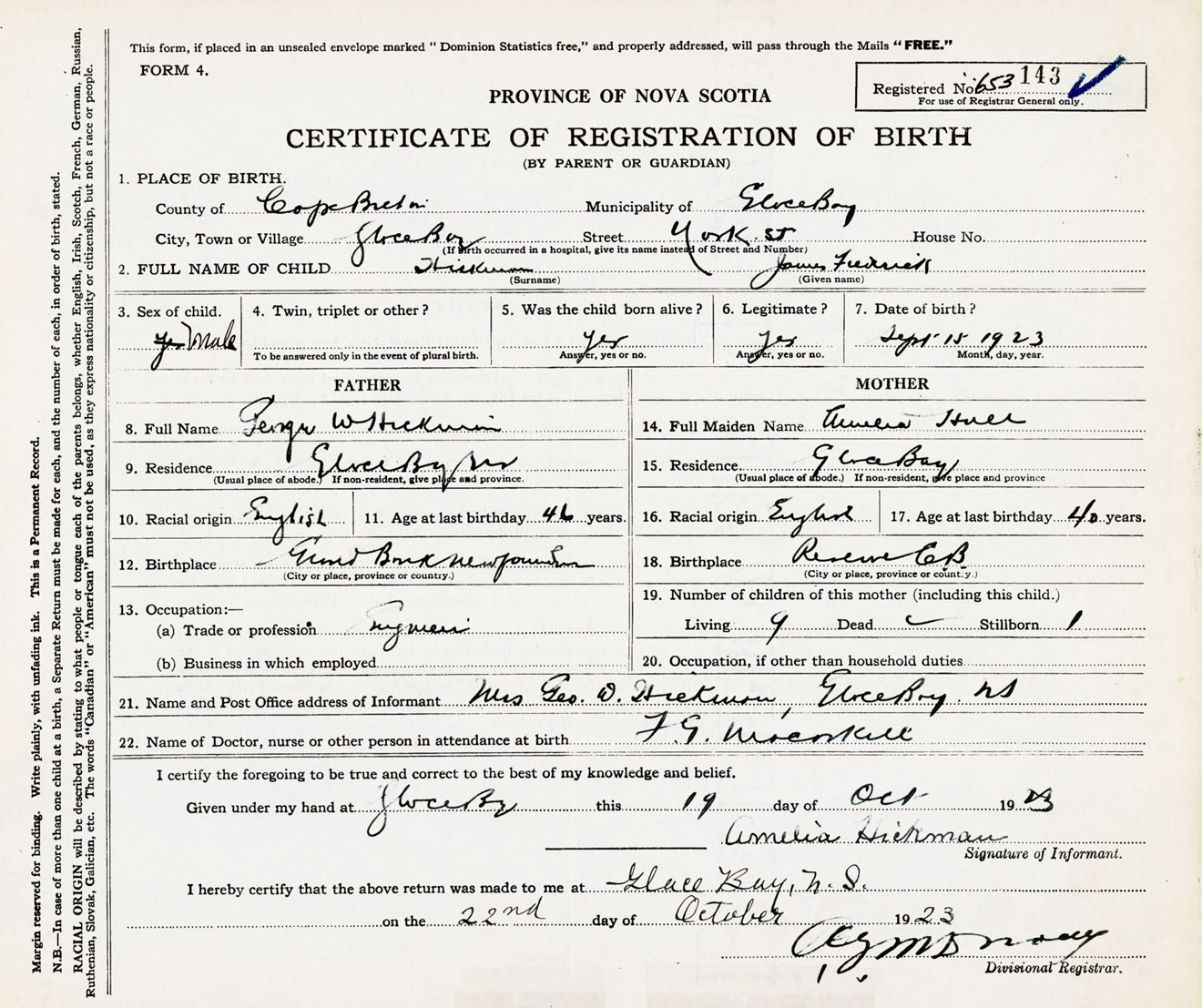 Male Birth Registration: Year: 1923 number: 65300143