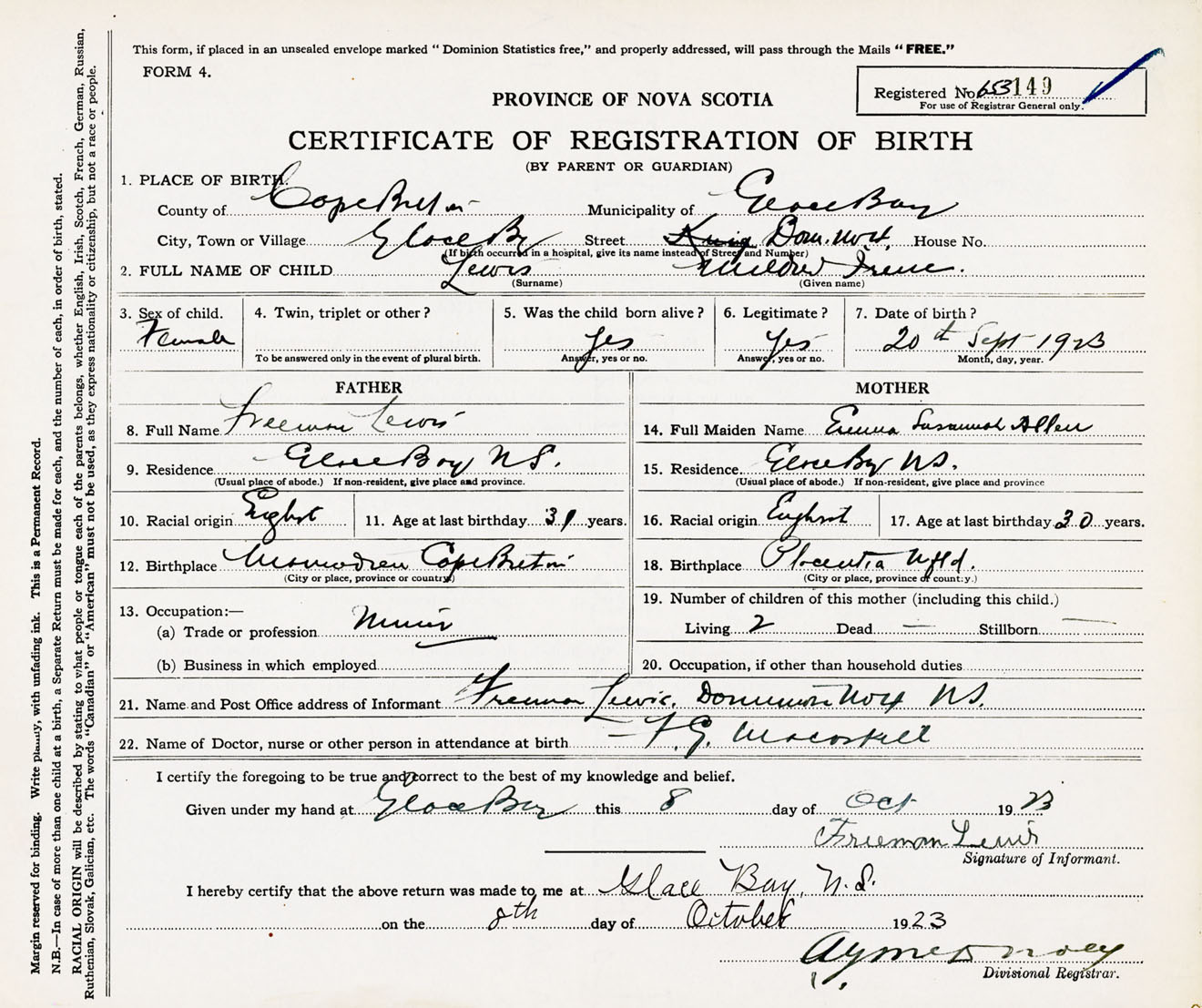Female Birth Registration: Year: 1923 number: 65300149