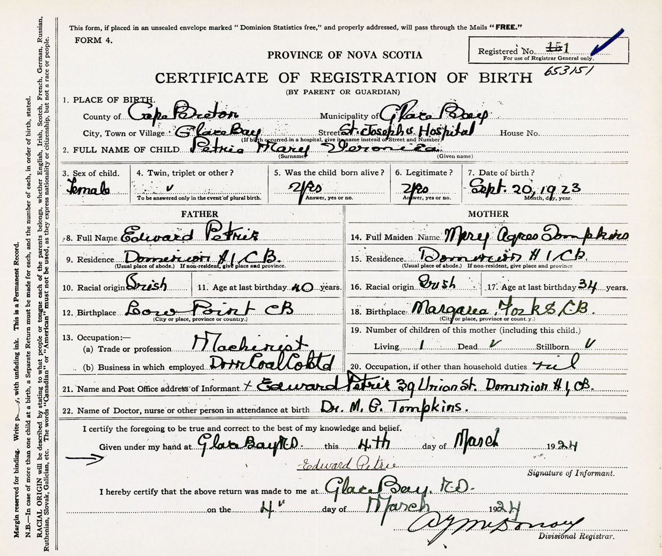 Female Birth Registration: Year: 1923 number: 65300151
