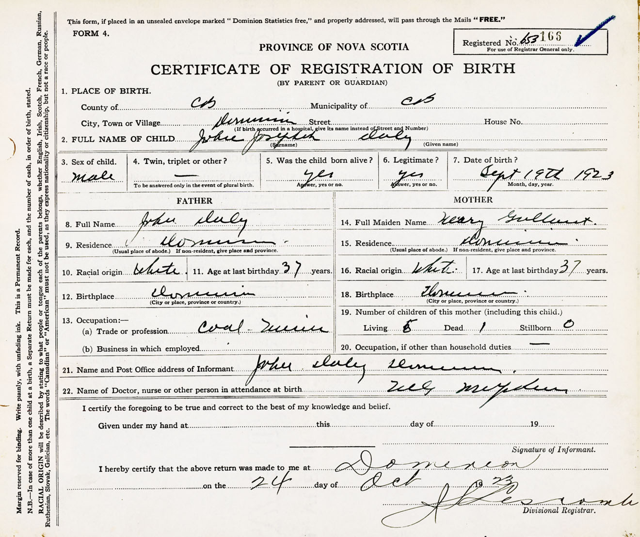 Male Birth Registration: Year: 1923 number: 65300166