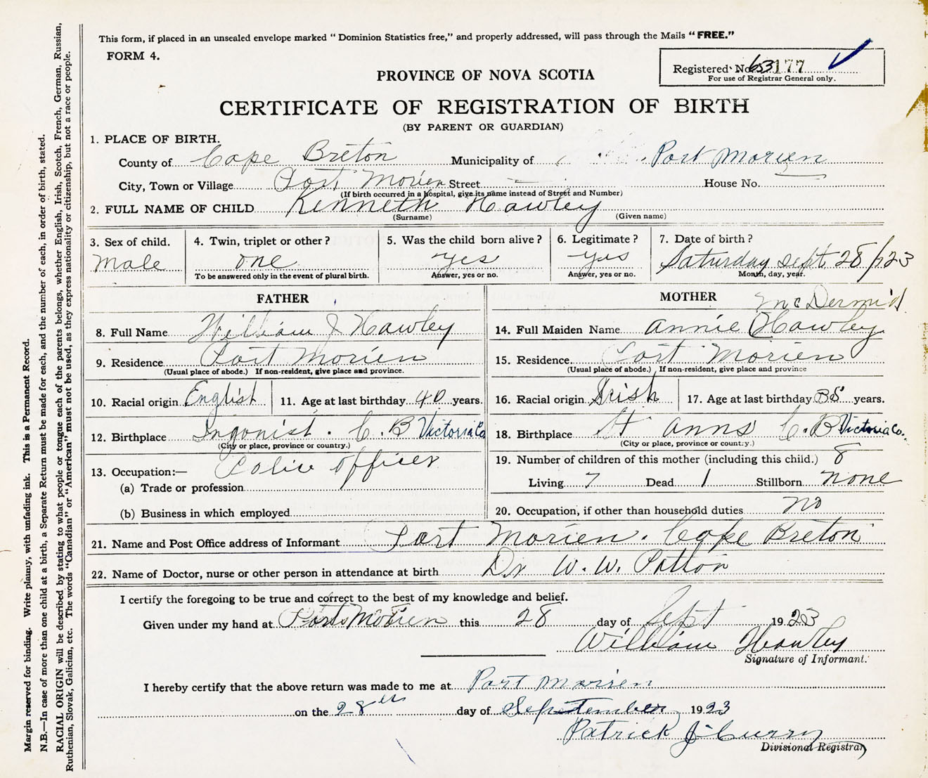 Male Birth Registration: Year: 1923 number: 65300177