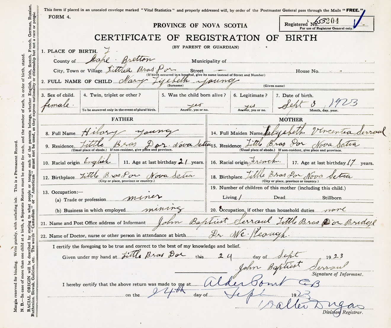 Female Birth Registration: Year: 1923 number: 65300204