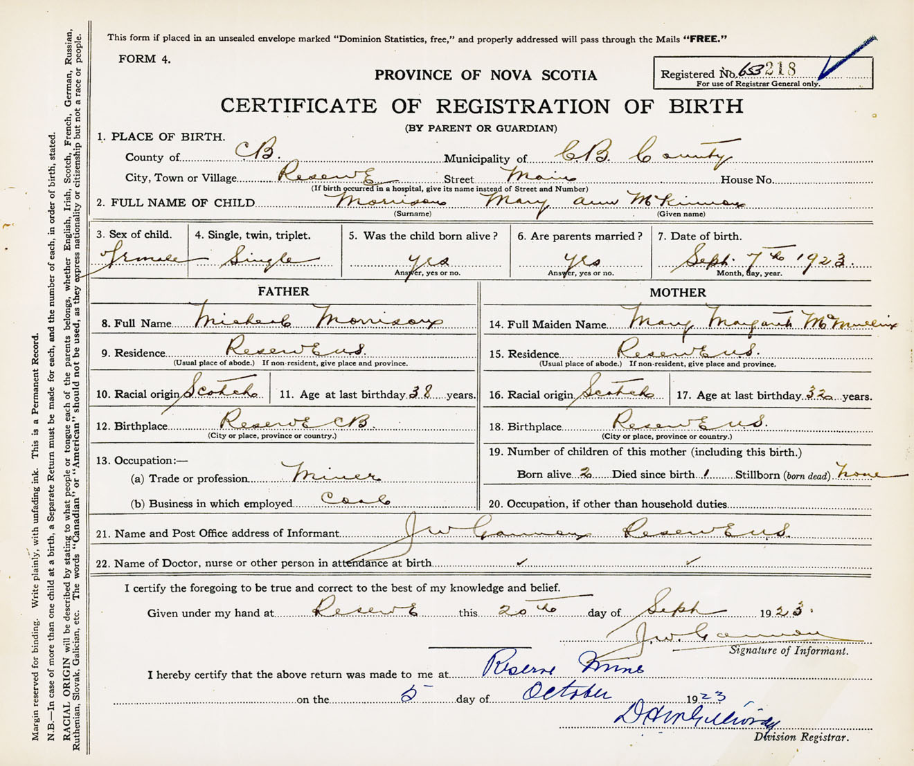 Female Birth Registration: Year: 1923 number: 65300218