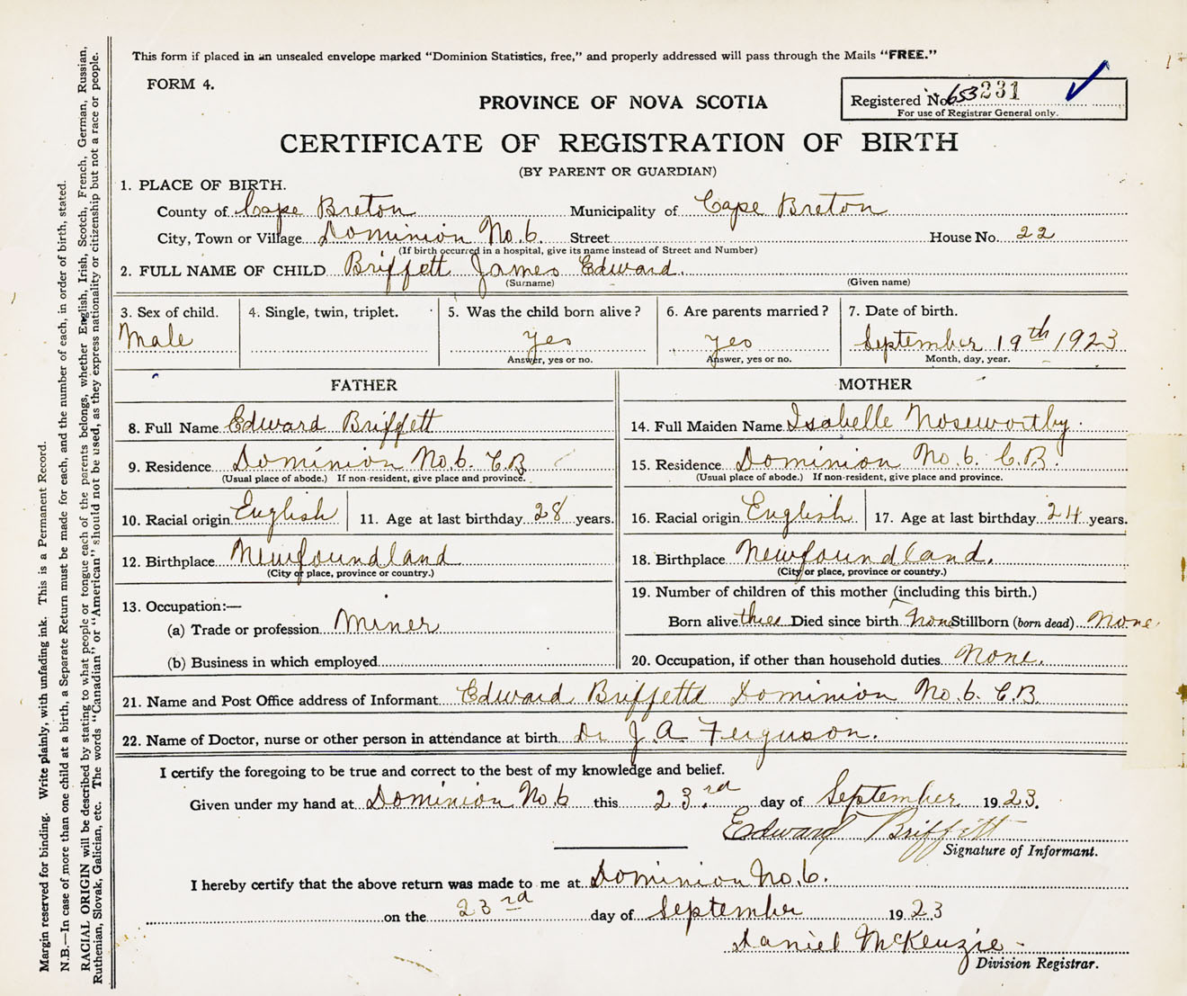 Male Birth Registration: Year: 1923 number: 65300231