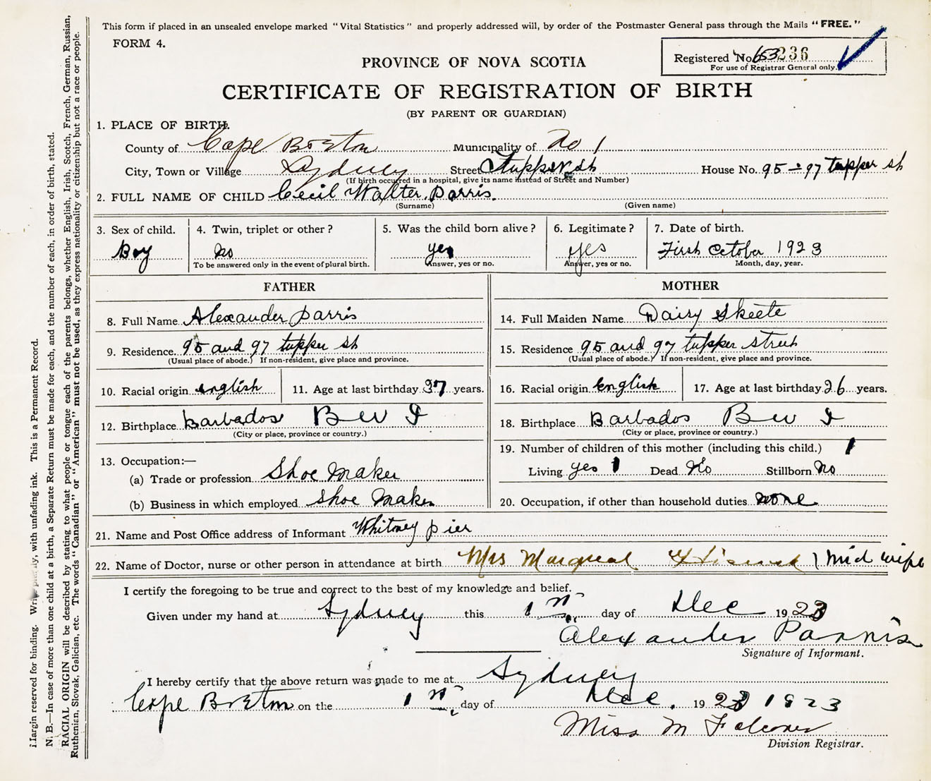 Male Birth Registration: Year: 1923 number: 65300236