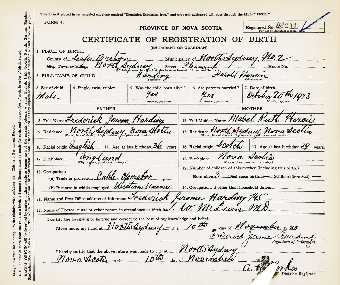 Male Birth Registration: Year: 1923 number: 65300294