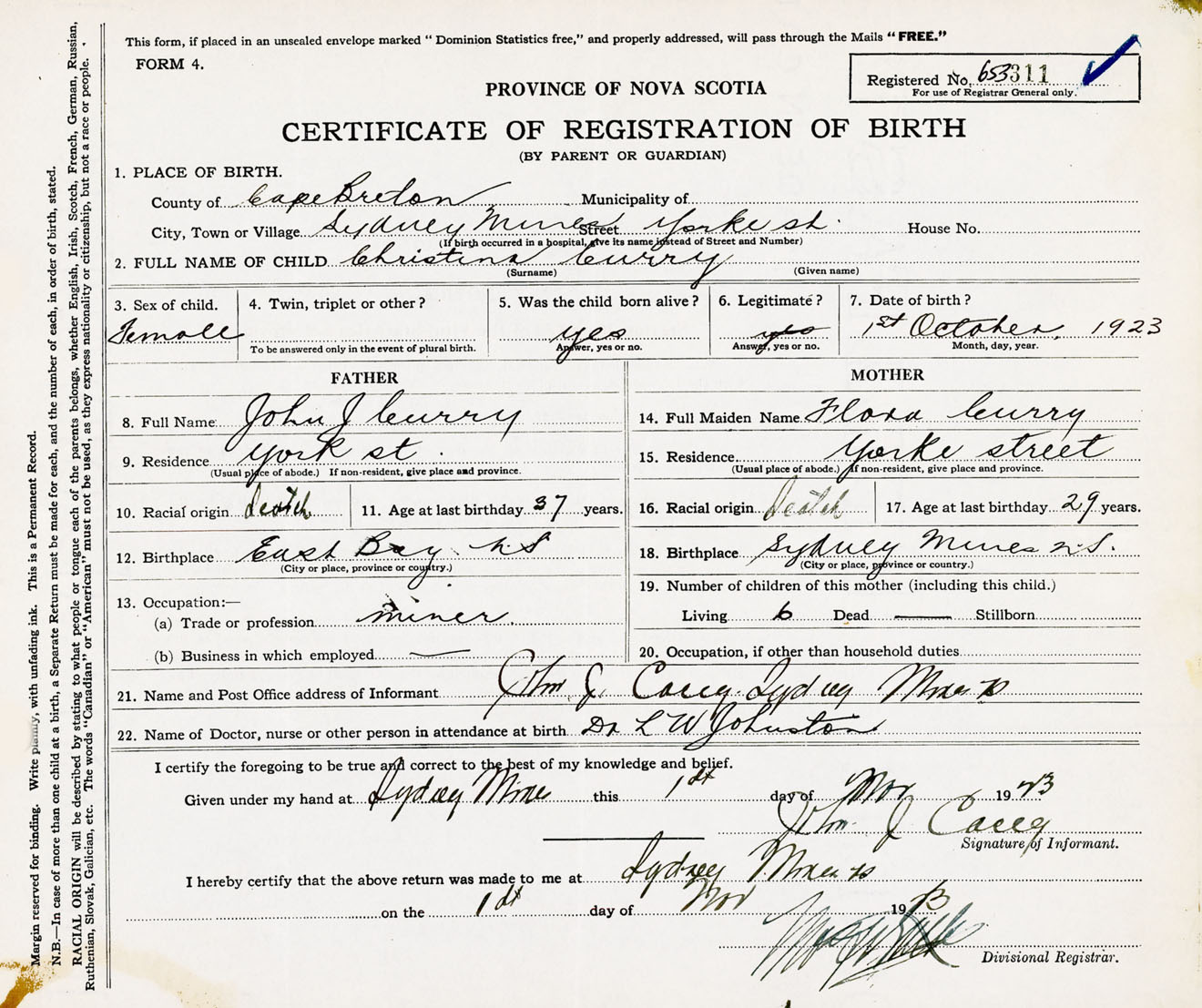 Female Birth Registration: Year: 1923 number: 65300311