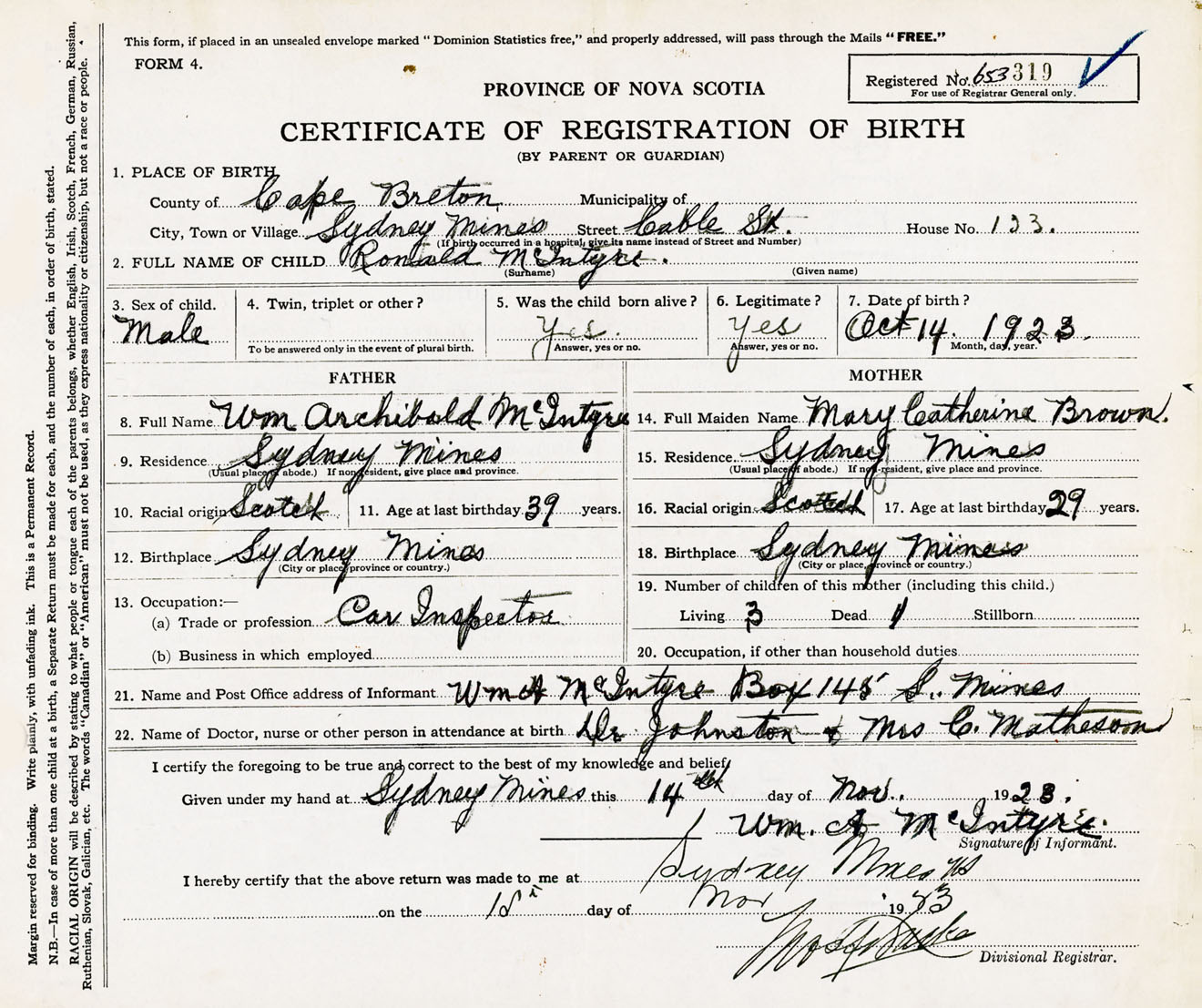 Male Birth Registration: Year: 1923 number: 65300319