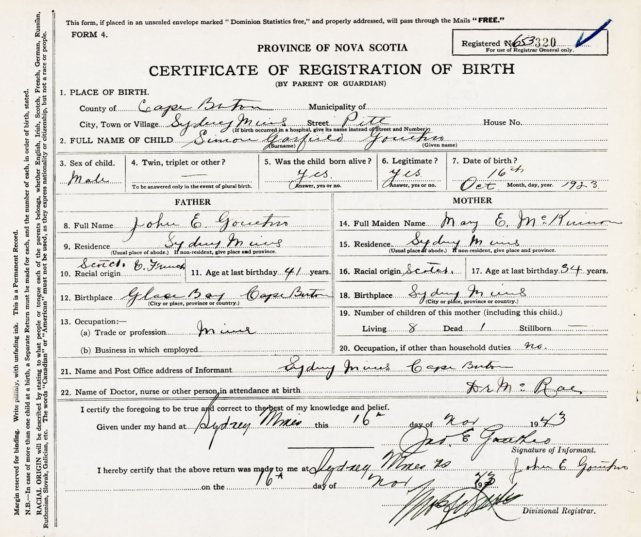 Male Birth Registration: Year: 1923 number: 65300320