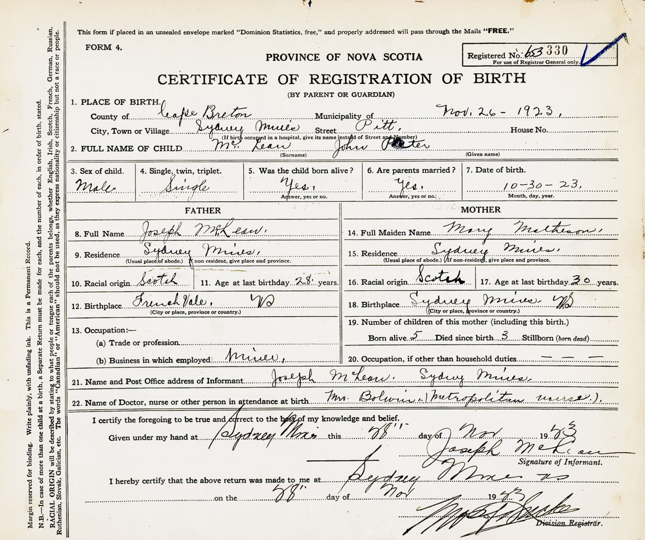Male Birth Registration: Year: 1923 number: 65300330