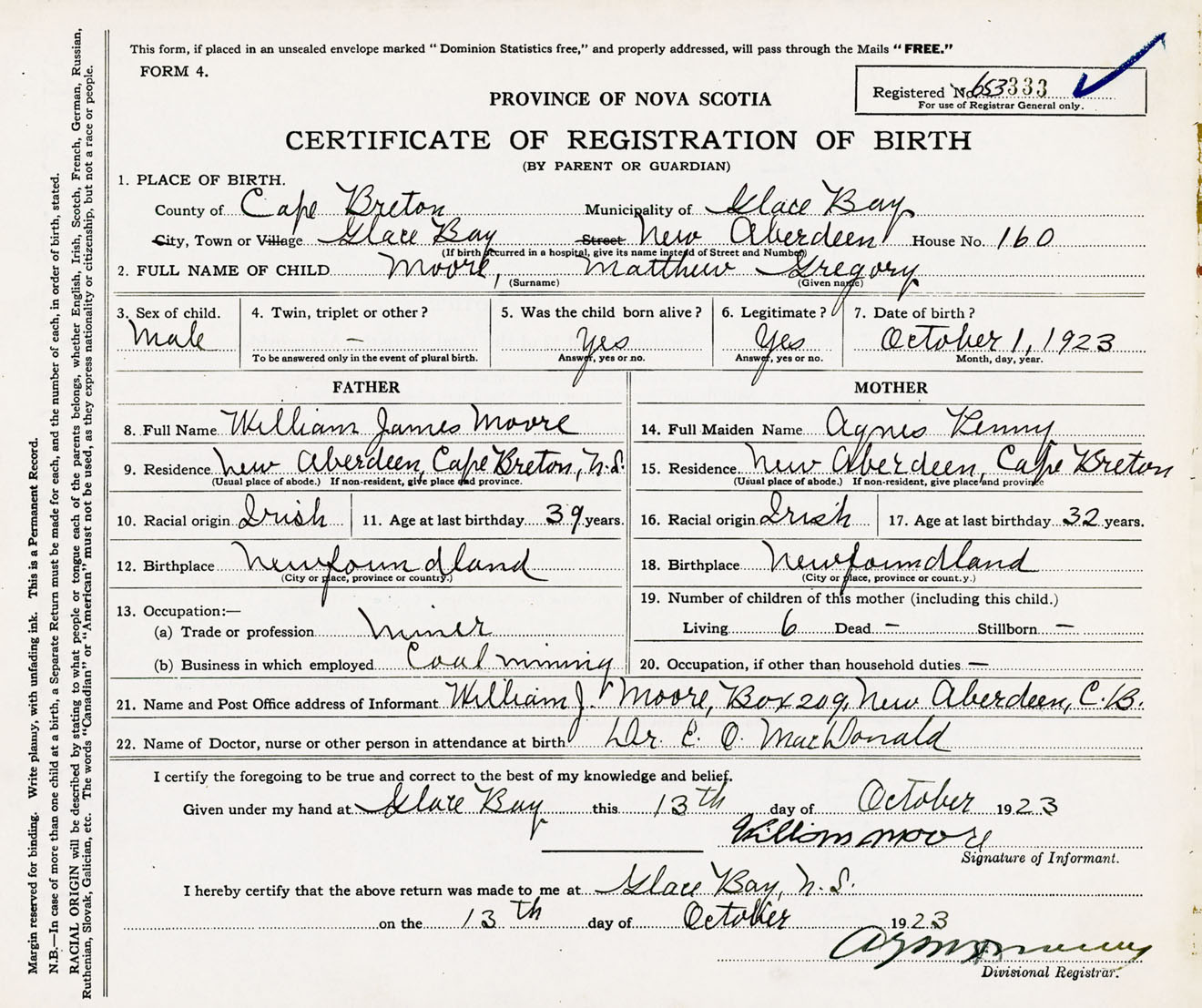 Male Birth Registration: Year: 1923 number: 65300333
