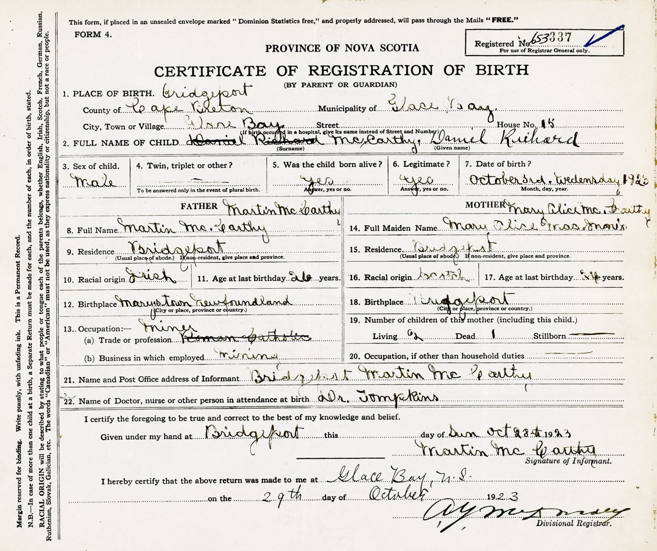 Male Birth Registration: Year: 1923 number: 65300337