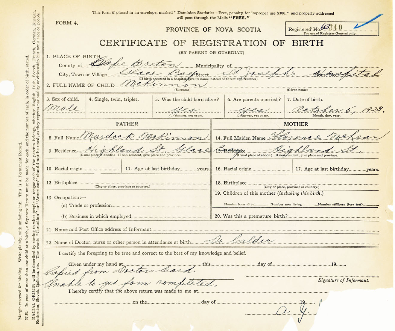 Male Birth Registration: Year: 1923 number: 65300340